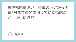 活動報告 谷塚松原線沿い、東武ストアから国道4号までの間で消えていた街路灯が、ついに点灯